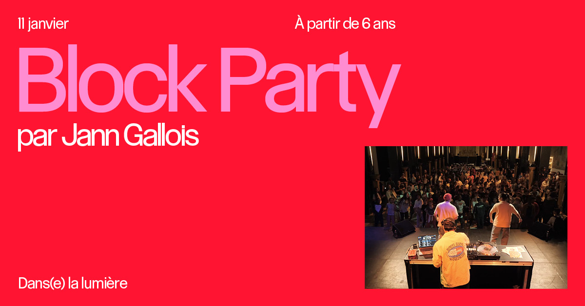 Bon moment assuré ! La compagnie BurnOut propose ici un voyage dans le temps à la découverte des musiques qui ont marqué l’histoire du hip-hop. Embarqués par le mix live de DJ Davy et guidés par les danseuses et danseurs de la compagnie, Block Party est l’occasion de se déhancher tout en apprenant les mouvements phares de la danse hip-hop dans une ambiance joyeuse et festive.